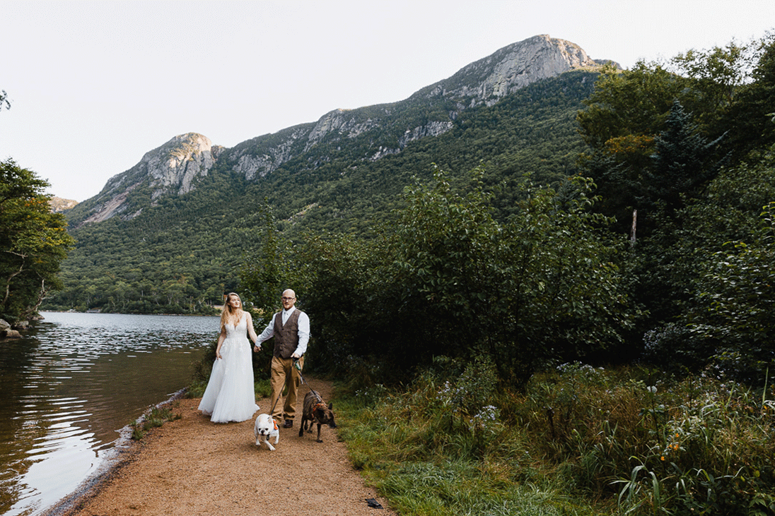 There are a few lakes with stunning mountain backdrops in this area. During the summer months, there is a fee to enter, and it is usually crowded with swimmers, so I only recommend it early in the morning or later in the evening. In the off-season, it is the perfect spot to take a stroll and see the lake in its full glory. There are also a few gorgeous and quick hikes leading to stunning overlooks of a lake and the mountains surrounding it. Also, right in this area is access to Cannon Mountain and its gondola which boasts incredible views and a lot of fun as an elopement day activity. Check out this gallery.
